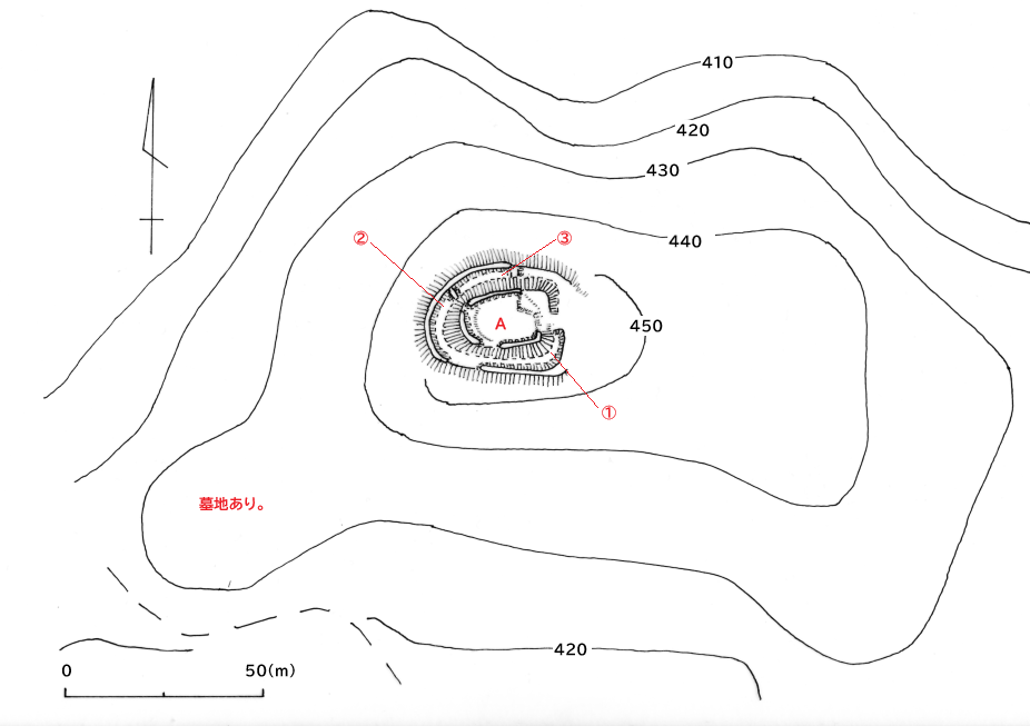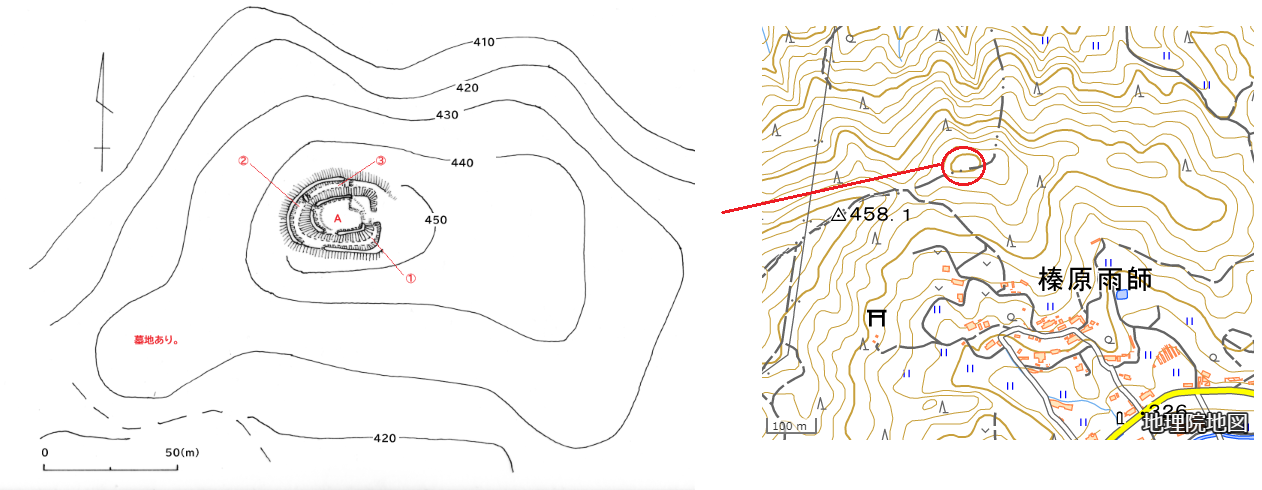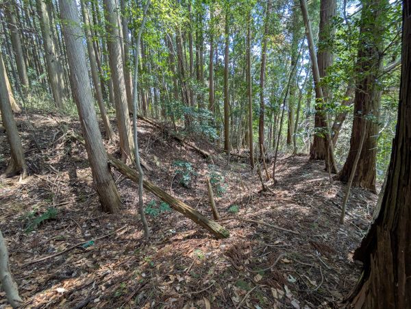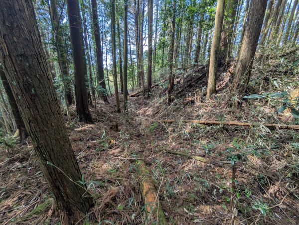 この城は奈良県遺跡地図に掲載がある城で、榛原雨師側からの比高も低く、松永方の陣城、初瀬谷を監視するための城、などの可能性があります。主要部となる城跡の規模は小さく、特筆すべき点は横堀を巡らしている点です。重要な武将がこちらに入っていたのかもしれません。西側は墓地があり、改変はあります。東側は地形図通り平らな地形となっており、兵士などの駐屯には適しているのではないでしょうか。小規模ながら遺構が明瞭なのでおすすめの城跡となります。西にある嵩山城とセットで巡ると良い運動量となります。 ※動画は後日アップ Googleマップリンク |