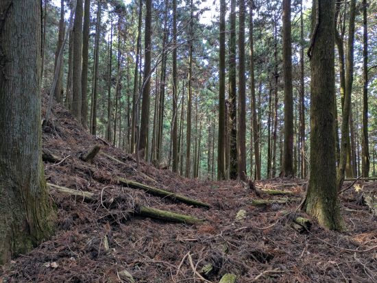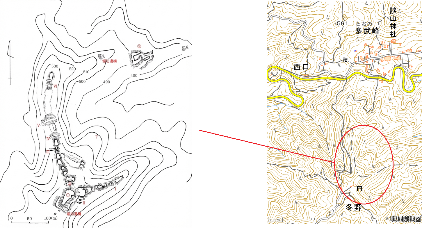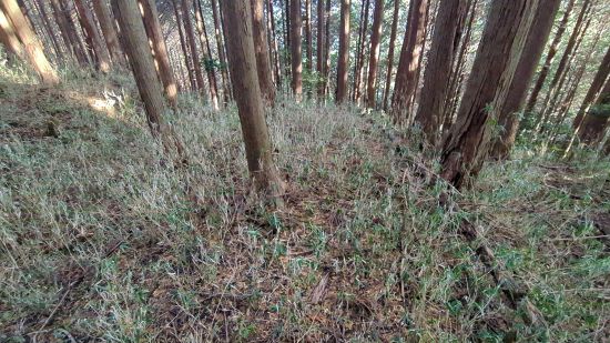 改めて訪問しました。前回の訪問分と合わせて見て頂ければと思いますが、談山神社が平時の居住空間と考えたときに冬野城は詰めの城、と見ることができると思います。ただ、WとXの堀切は談山神社側の方が高さが若干高く、単純に地形の問題なのかとは思います。Wの南側は基本的に自然地形となります。@主郭の南側は堀切の遺構の南側は神社となっており、こちらは踏査できませんでした。土檀状のものや竪堀、も見られますし『近畿の城郭』に表記があります。北側は郭が階段状に続く連郭式であり、特に北西側の峰が堀切を断続的に配した構造となっています。特にWとX、Yは明瞭に残っています。UやVのような人工的な竪堀遺構も見られます。Bは城跡の遺構なのかどうか判断がつきませんが、人工的な地形でした。冬野城に関連する施設では無いとは思われます。この城は連郭を楽しむことが出来る典型的な山城跡となります。 Googleマップリンク |