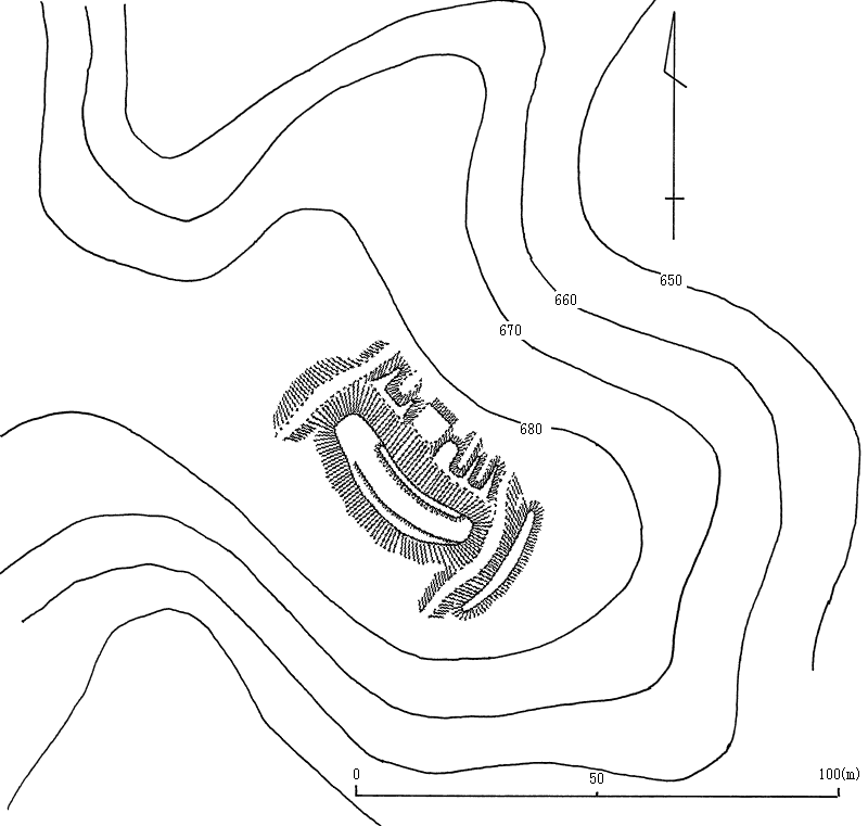 この城は、東吉野村平野にある城跡です。『近畿の城郭』によると、ハタツカ城とも呼ばれているようです。平野は伊勢本街道と和歌山街道をつなぐ街道が通る要衝で、平野川により谷地形が広がっています、その麓の街道を監視する為の城跡と考えられます。現地に領主がいたかなどの伝承や史料は伝わっていないようですが、天文16年(1547)に芳野氏の所領であったことが確認できるようです。 城の概要ですが、城の規模こそ小さいですが@部の主郭があり両北南端に堀切、また@の東側にAの畝状竪堀群がある点が特徴になります。緊急時に非難する要害、と言った感じです。この城の入城ルートは現在麓には住宅が数件建っており、そこから城跡へは南東に伸びる尾根筋に城道の痕跡があり比較的登りやすいと思います。東側は道から入るには急峻なため、直登になってしまい登城に向きませんが、そこを登りきると比較的平坦なところがあり、監視目的の何かしらの施設が存在していた可能性があります。南西はかなり急峻、北東面は比較的攻められやすいと考えられていたので、竪堀群があるのだろうと推定、します。ただ、かなりの運動量が必要で、比較的危険です。 昔の事情が分からないのですが、畝状竪堀を備えたこの城跡がどのように見られていたのか、かなり外れた言い方が悪いですが、寂れたこのような奥地に軍事的緊張があったことが想像することは容易ではありません。 Googleマップ |