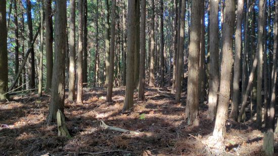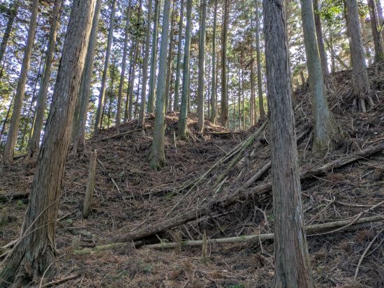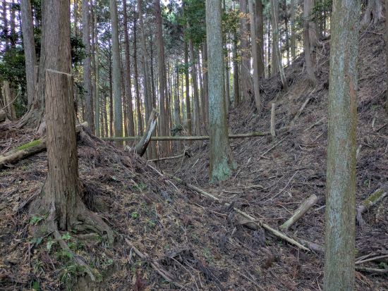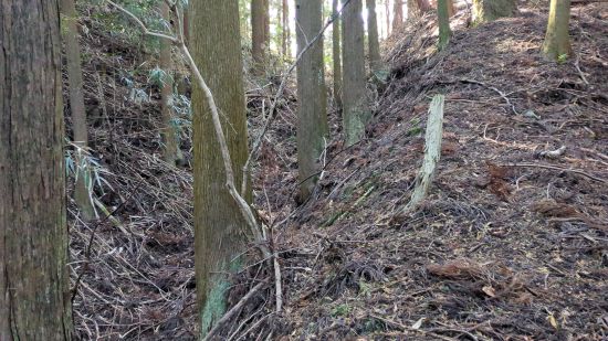 改めての再訪となります。「ねずき」城は、多武峰談山神社の西方にあり、西の守りの要として深い堀切を稜線上に配した城となります。T〜Vのような竪堀状の遺構も見られ、DやEのような北面に堀切状の遺構も見られ、まさに要害といった趣です。Cの堀切は舗装された道路となっており、後世に増賀上人の墓も造られていることから改変された地域もあると思われます。@は比較的きれいに削平されており、この城の主郭とみてもいいのではないかと思います。Bの堀切は下を走っている林道からも竪堀状に落ちているのを確認することができます。今でこそ、周辺は車でも走れるような林道が走っていますが、当時は山上からの移動だけと想定すると、突然このような要害が現れるのは心理的に攻め手の戦意を挫くのに効果はあったと思われます。 Googleマップ |