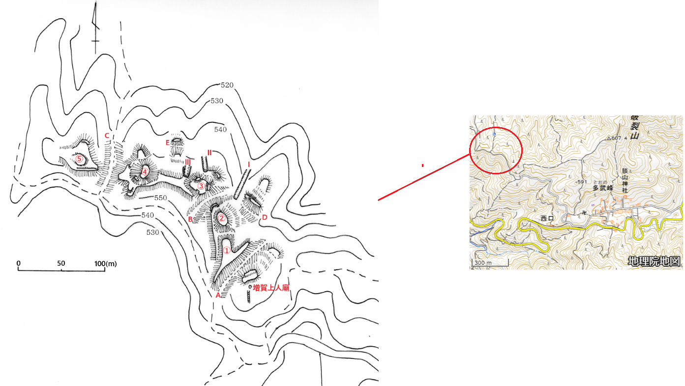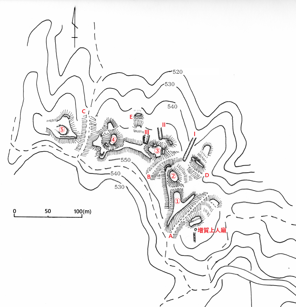 ![]() A堀切 ![]() @郭 ![]() D堀切 ![]() U竪堀 |
