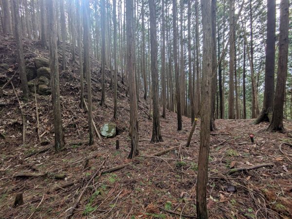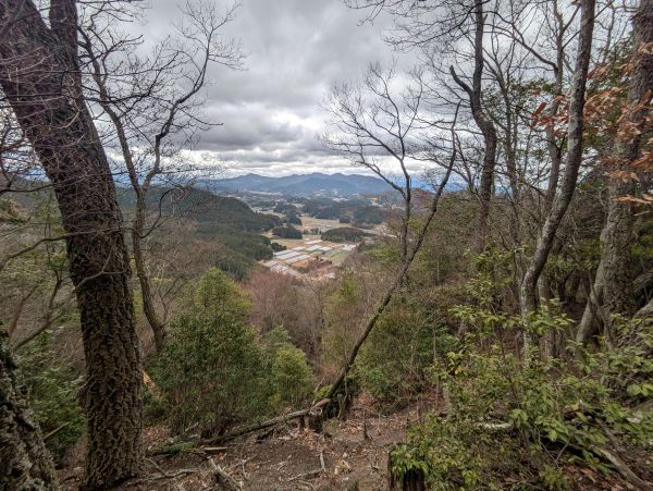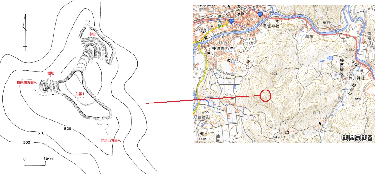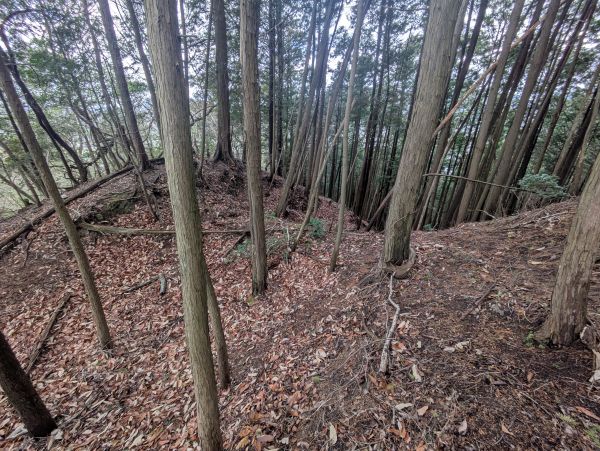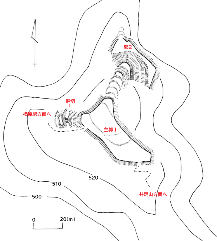 榛原駅から南へ約1kmの場所に位置し、「岳山」と呼ばれている山頂に位置します。西の榛原駅から「井足岳登山口」に至り、西側から登っていくことが可能です。この岳山から東へ向かうと井足岳、さらに伊那佐山へつながるトレイル道が整備されています。さらに南には沢城へも繋がる形となります。山頂が開かれている山ですので、西から北西面に睨みを利かせる場所に位置していること、西側に堀切遺構があり北側にも郭のような平場があり、城跡としました。 城跡として認定されているのかどうかわからない状況ですが、奈良県遺跡地図や他文献等には確認ができませんでした。 堀切は登山道により南側が土橋のような感じになってしまっているので改変はあると思います。郭2に関しては、ここになぜこのような削平地を造ったのかという感じにはなると思いますが、岩盤が露出している山となりますので、この郭を作るのにこの岩盤を壊して造ったと想像するとそこそこの土木工事になると想定します。さらにここから北側に連絡するために造った郭になるのでしょうか?さらに北は未踏査ですが、何かしらの監視所があったかもしれません(地図に「・502」と表記されているところ)。西側900mの地点に井足城があり、その井足城に対する詰めの城として機能していた可能性もあり、沢城の出城的な役割を果たしていた可能性もあります。 Googleマップリンク |
