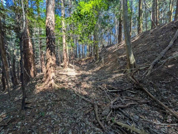 ![]() B空堀と切岸。 ![]() Aの空堀を北側より撮影。 ![]() 主郭を北東側より撮影。 |