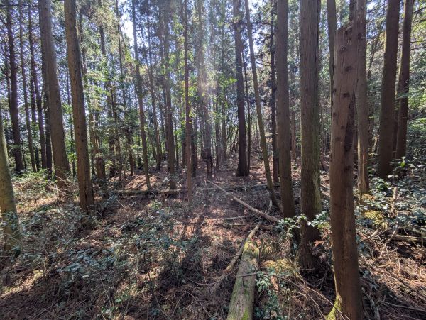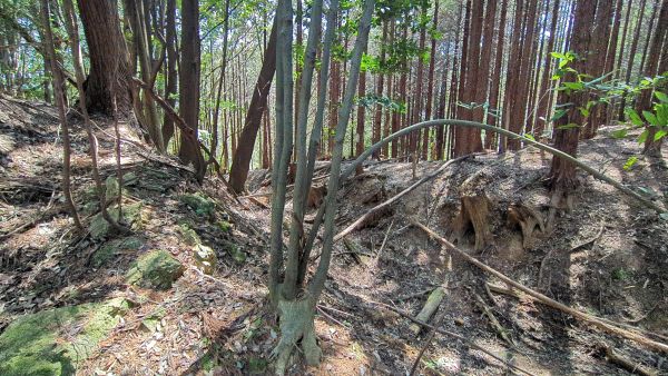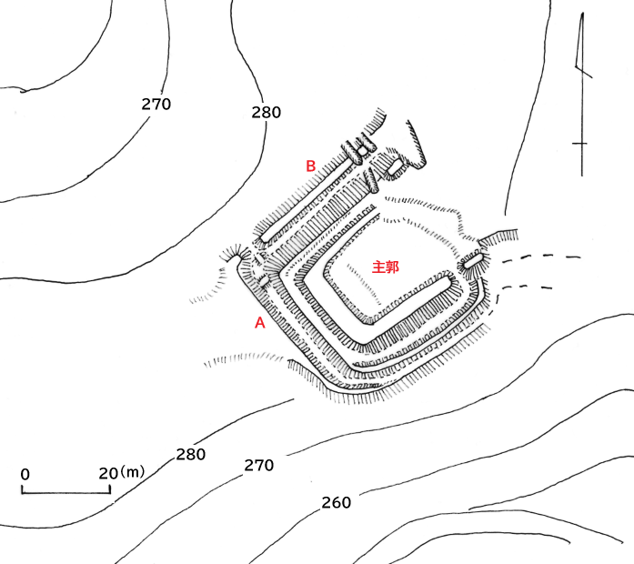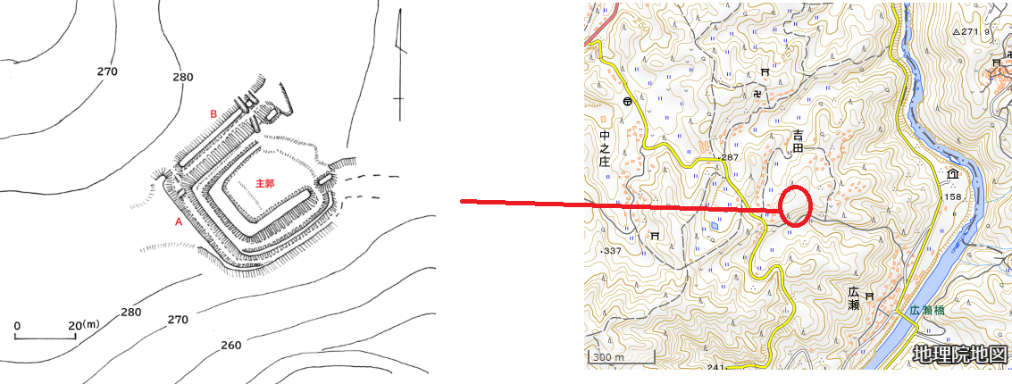 山添村吉田にあり、城山と呼ばれています。『城郭大系』には、空堀・堀切・井戸などの遺構が見られると記述がありますが、井戸の遺構を見落としていると思うのですが確認できていません。AとB側に長い空堀を配した東山内に特有の方形単郭の城となります。主郭周りに一段低い溝のようなものが巡っているのですが南西側は平らになっており、この作事が根切溝のように見えなくはないのですが、わかりません。農地としての活用など、後世の改変がこの辺り感覚ですがあるような気がします。北東側は防御は薄く、備える必要がなかったと想定され、自然地形のままとなっています。 この城の見どころはAとBの主郭周囲になると思います。B側の北側に竪堀の遺構も見られるので、そのあたりは守備を意識したものなのかもしれません。こちらのサイトには、竪堀のあたりに井戸の遺構があったと書かれていましたので、井戸を守るためのものとも想定されます。 ※動画は後日アップ Googleマップリンク |